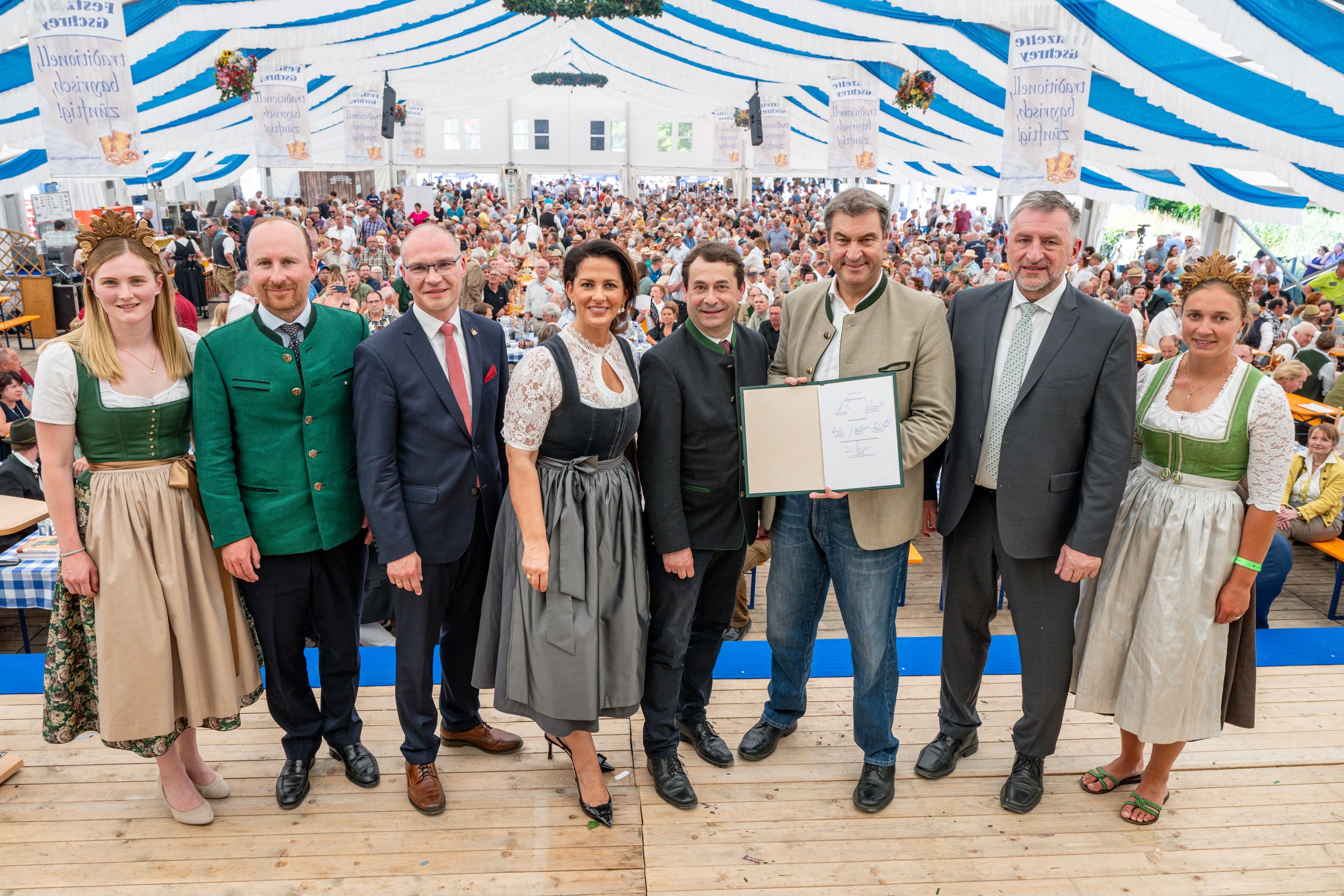 Vor mehreren tausend Waldbesitzern und Vertretern aus der gesamten Branche haben Ministerpräsident Dr. Markus Söder und Waldministerin Michaela Kaniber zusammen mit den forstlichen Verbänden den "Waldpakt für Bayern" unterzeichnet. Ministerpräsident Dr. Markus Söder würdigte den Pakt als einzigartigen Schulterschluss für die Zukunft unserer bayerischen Wälder: "Bayern ist Waldland: Wald ist prägend für die Seele unseres Landes. Mit dem heutigen Waldpakt mit den Waldbesitzern geben wir ein klares Bekenntnis zu unserer Lebensart und zum Eigentum. Er schafft die richtige Balance aus Schützen und Nützen unserer Wälder. Wir wollen kein Stilllegen von Flächen und kein Verbot von Holzheizungen. Denn Holz ist unser nachhaltiger und natürlicher Rohstoff. Es ist wichtig, dass unser Wald zum Klimawald umgebaut wird, aber mit den Waldbesitzern und nicht gegen sie. Sie sind die besten Klimaschützer und haben unsere volle Unterstützung verdient. Danke für die harte Arbeit! War heute sehr gern beim Großen Bayerischen Waldtag in Kelheim in Niederbayern dabei." Forstministerin Michaela Kaniber zufolge ist der Waldpakt die partnerschaftliche Richtschnur für eine auf Dauer erfolgreiche Waldpolitik im Interesse der gesamten Gesellschaft und zudem ein dringend notwendiges Signal gegen die eigentumsfeindliche Verbotspolitik der Ampelregierung: "Statt auf Stilllegung und Vorgaben setzen wir in Bayern auf ein aktives Bewirtschaften und Pflegen unserer Wälder. Denn nur so können wir in der Klimakrise den Wald für kommende Generationen erhalten. Unsere Waldbesitzer leisten mit ihrer täglichen Arbeit und ihrem Engagement einen unverzichtbaren Beitrag für die Schönheit und die Zukunftsfähigkeit unserer Heimat. Deshalb unterstützen wir sie in Bayern auch künftig nach Kräften: durch eine Waldpolitik, die ihnen Vertrauen entgegenbringt, ihnen Handlungsspielräume verschafft und sie nicht durch immer neue Verbote und Beschränkungen gängelt." Angesichts der gewaltigen Herausforderungen durch den rasanten Klimawandel sowie den ideologischen Bestrebungen auf Bundes- und Europaebene, die Waldbewirtschaftung und Holznutzung immer weiter zu erschweren, steht die Staatsregierung laut Ministerin Kaniber fest an der Seite der 700.000 Waldbesitzer in Bayern. Eine schnelle, wirksame Anpassung der Wälder an die Folgen des Klimawandels zur Sicherung deren vielfältiger Leistungen – von Holznutzung über Klimaschutz und Biodiversität bis hin zu Erholung – ist das übergeordnete Ziel des Waldpakts. Dazu müssen die Förderprogramme und Finanzierungsquellen gesichert, waldverträgliche Wildbestände auf ganzer Fläche geschaffen und dem Fachkräftemangel entgegengewirkt werden. Darüber hinaus fordern alle Unterzeichner des Waldpakts die aktive Pflege der Wälder auf Bundes- und Europaebene nicht zu torpedieren, sondern ihren Wert für Mensch und Natur endlich entsprechend zu würdigen.